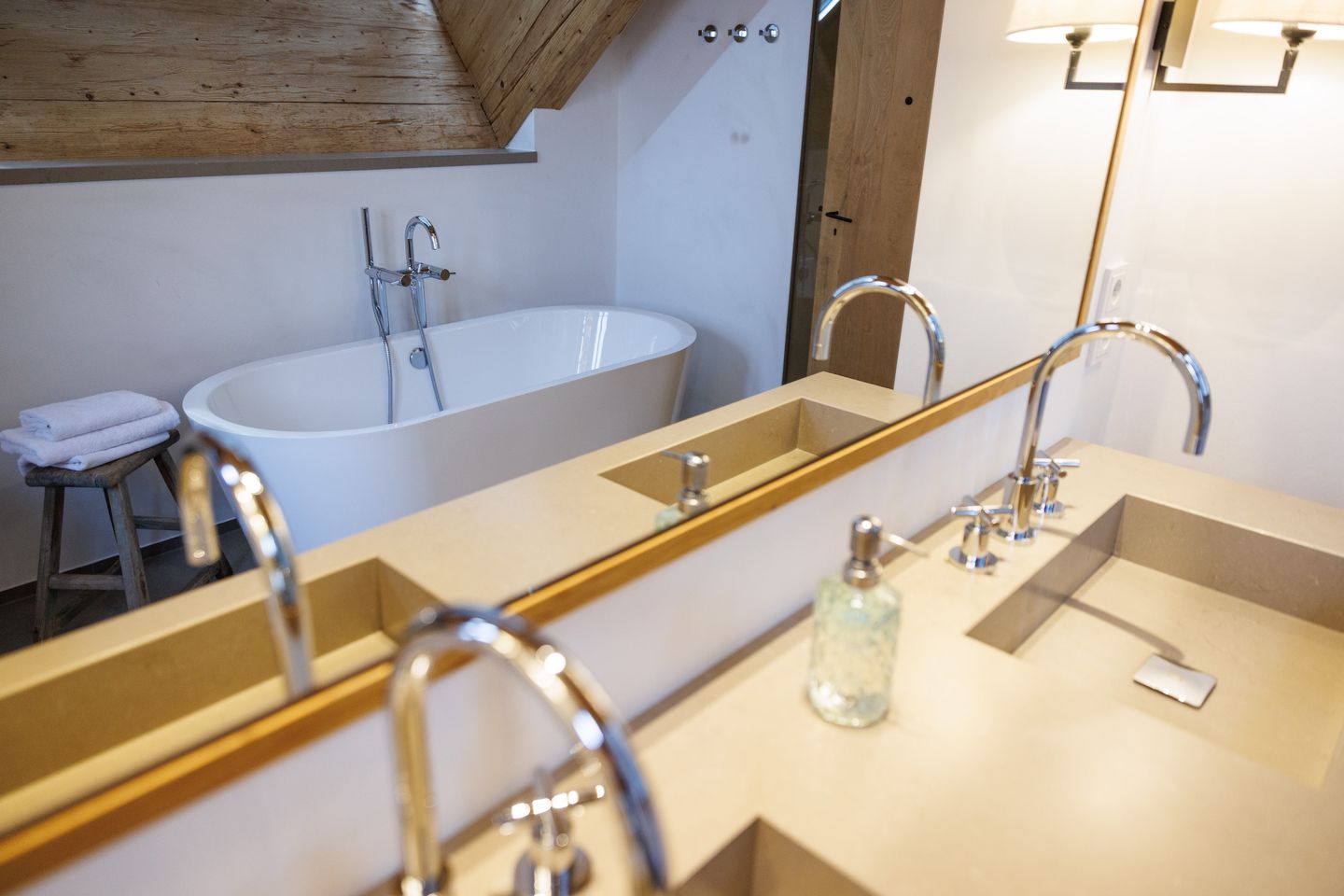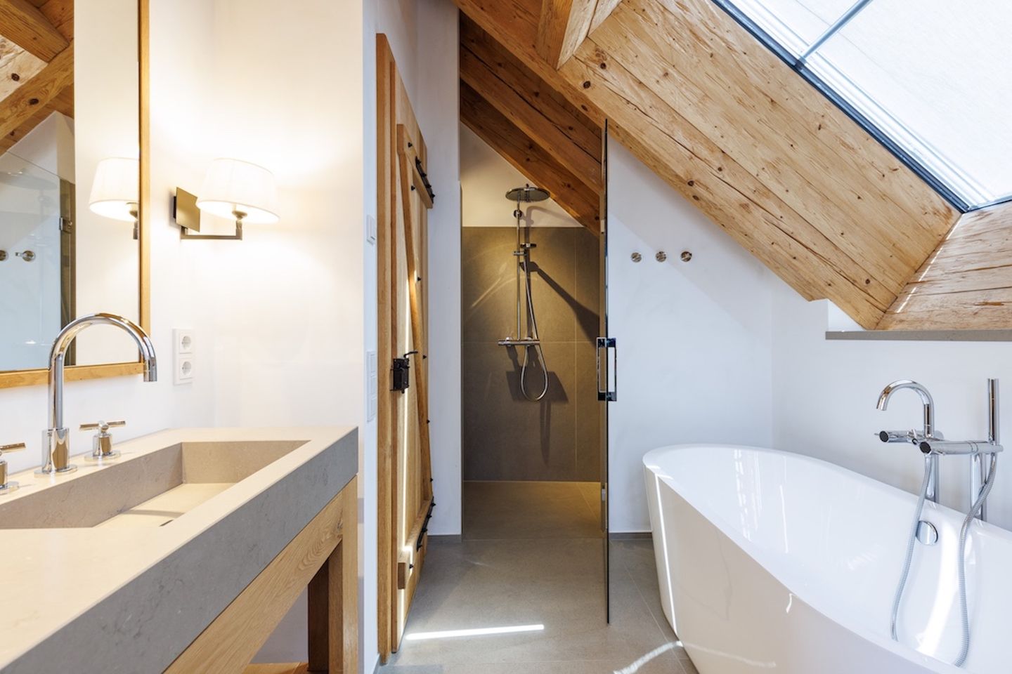 Ein Highlight für Wellness-Liebhaber sind die beiden Badezimmer – luxuriös und modern lassen sie keine Wünsche offen. Das Badezimmer unter dem Dach begeistert durch das große Dachflächenfenster, durch das man beim Liegen in der freistehenden Badewanne abends das beleuchtete Kloster Grafschaft erkennen kann.