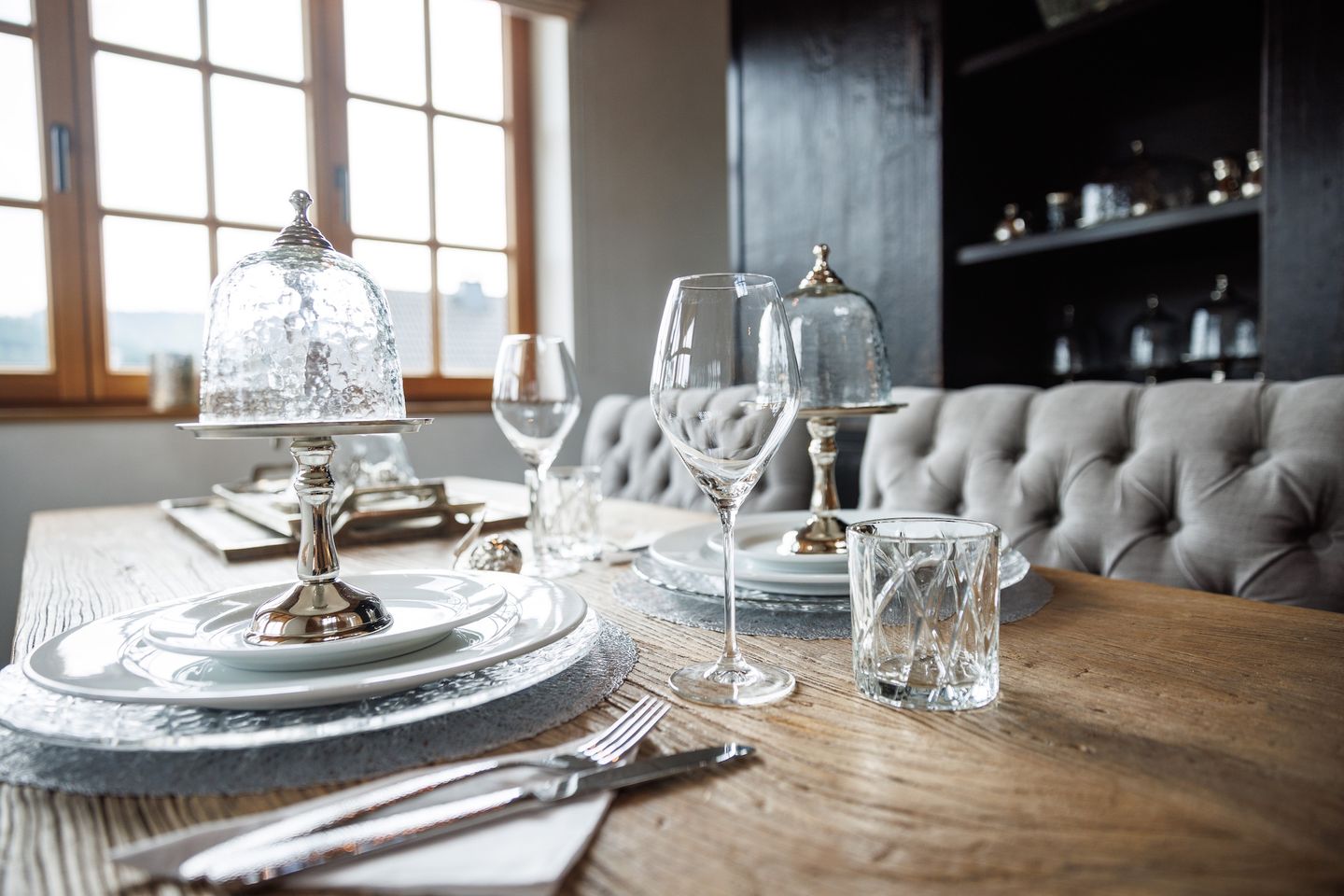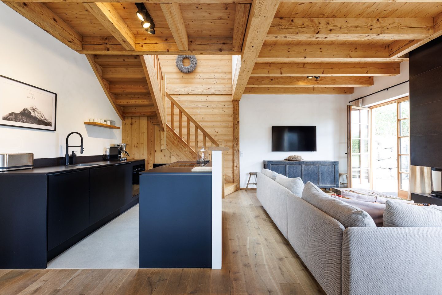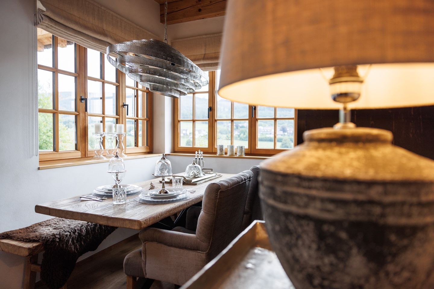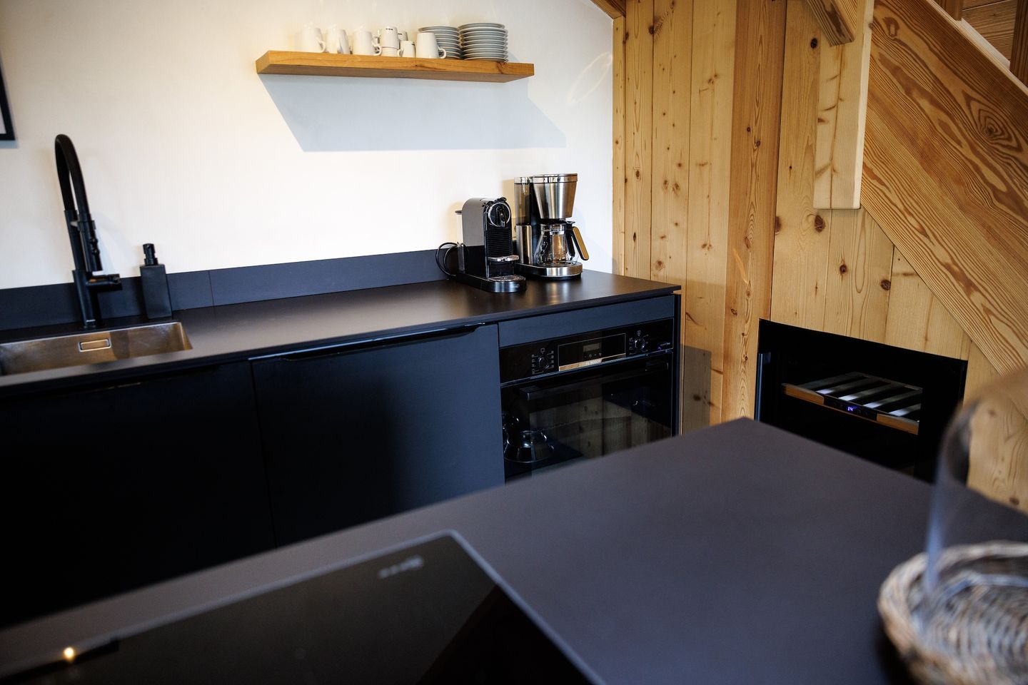Der gesellige Mittelpunkt der Romantikhütte ist der großzügige Wohn/Ess-Küchenbereich. Hier treffen sich alle zum vergnüglichen Kochen und Genießen. Ganz nach der Devise, „Viel Holz und alle Materialien so natürlich wie möglich“ – darf ein Holzofen für gemeinsame Mußestunden am flackernden Feuer des Kamins nicht fehlen. Die perfekte Voraussetzung um den Abend bei guten Gesprächen, bei Musik oder einem Glas Wein in geselliger Runde oder zu zweit zu verbringen.