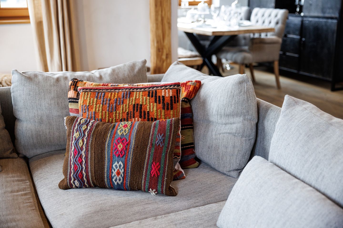Im Inneren der Romantikhütte empfängt Sie eine urig-luxuriöse Ausstattung. Alte Holzmöbel, warme Eichendielenböden, ein Ruhe ausstrahlender Holzkamin und viele gemütliche, schöne Kissen und Decken, Felle und Lampen. Genießen Sie diesen Wohlfühlort - angekommen und im Einklang mit der Natur.