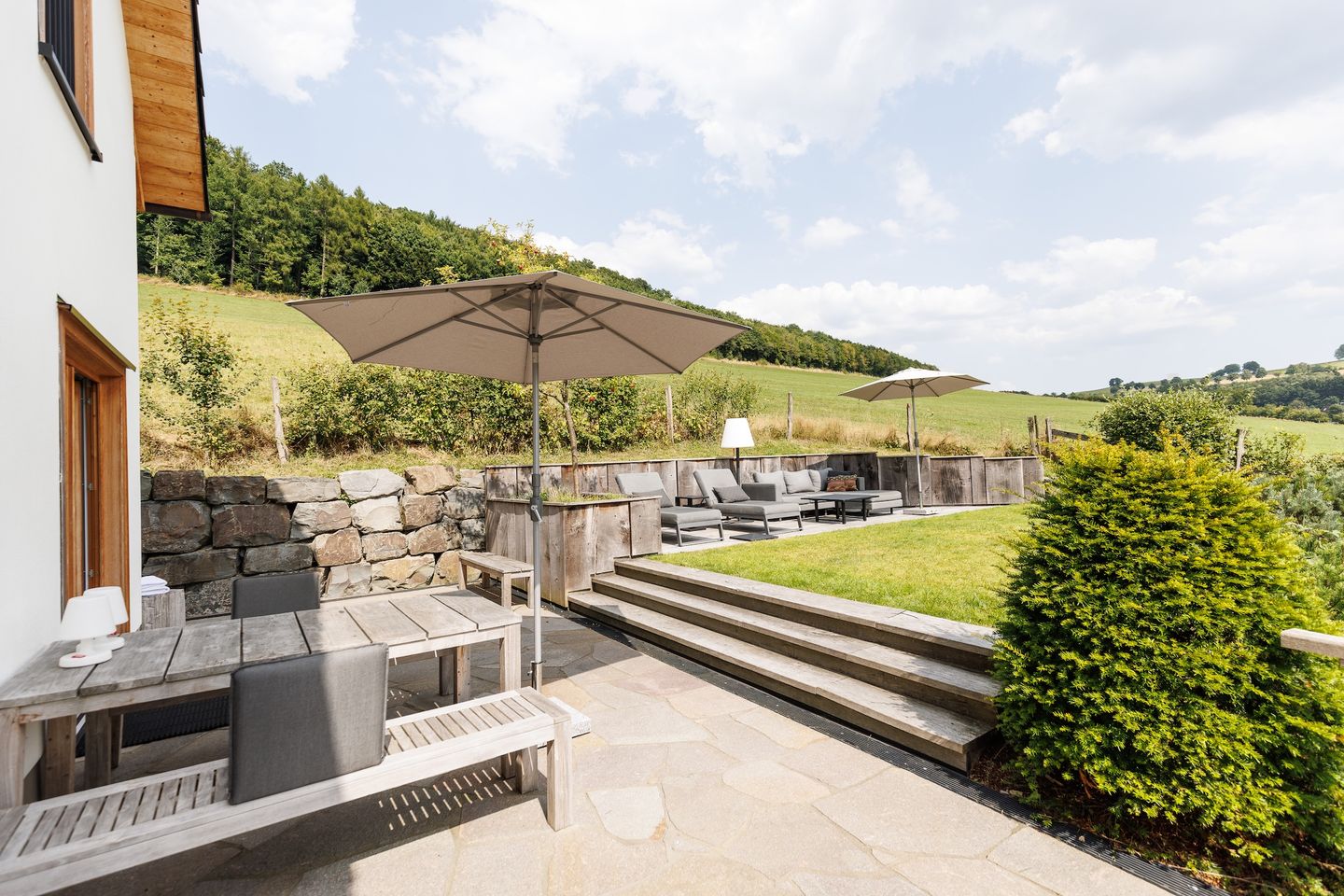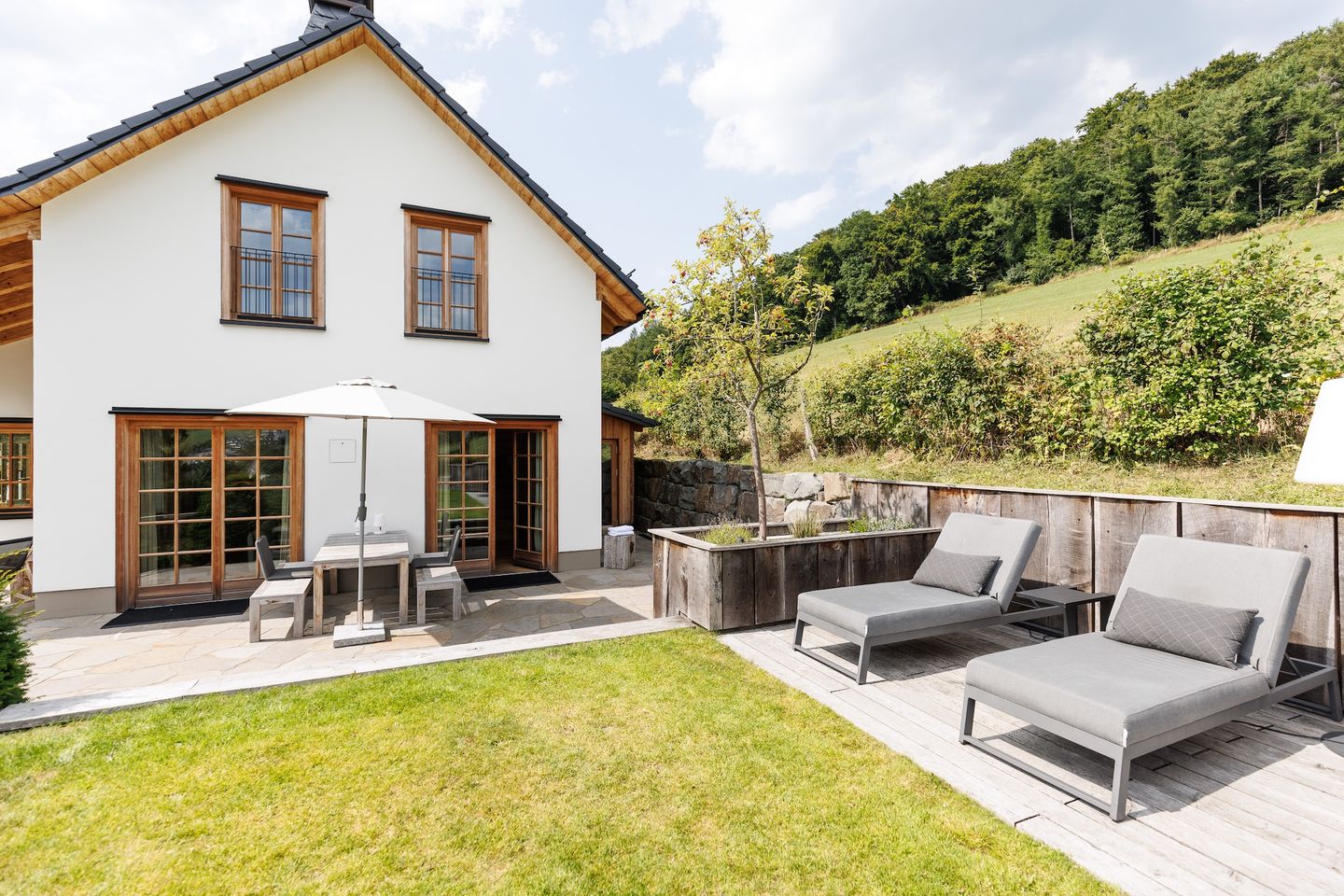 Der Außenbereich der Romantikhütte ist einfach fantastisch – er bietet neben der großzügigen Terrasse mit Tisch und Bänken noch eine weitere Sonnenterrasse mit Liegen und einem Loungesofa.